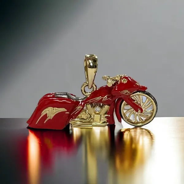 Custom 3D 14k yellow gold Low Rider motorcycle pendant with fiery red enamel and a diamond breather. Both sides fully detailed. Moveable tires are black rhodium coated.